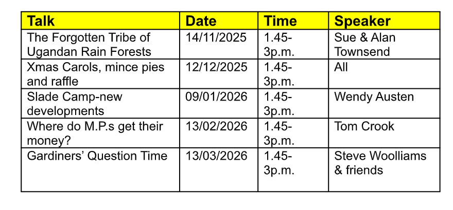 The organizers of the Community Lunches are delighted to announce they have confirmed the after-lunch speakers through to March 2026 - and what a fantastic array of topics, from the lost tribes of Uganda to the corruption of MPs - plus some gardeners' question time!